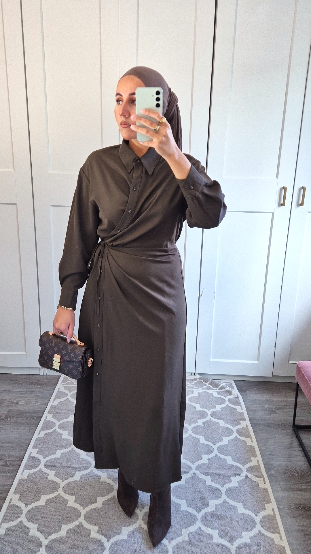 Een tijdloze wikkeljurk met een moderne touch. De jurk heeft een klassieke kraag en lange mouwen, en wordt elegant aan de zijkant gestrikt voor een mooie taille en een vloeiende, bescheiden look. De jurk heeft een elastieken band in de taile op de rug voor de perfecte fit. Makkelijk te dragen en past bij elke gelegenheid.