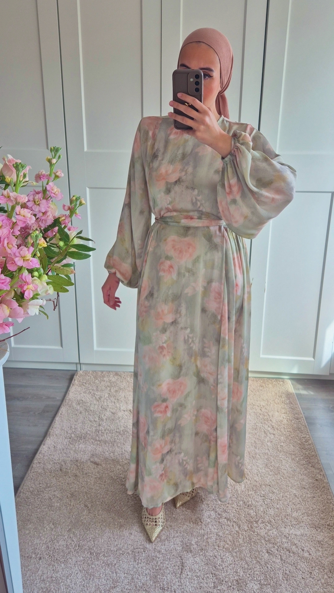 De luchtige stof valt soepel langs het lichaam en creëert een verfijnd silhouet dat zowel comfortabel als stijlvol is. De subtiele bloemenprint in pastelkleuren geeft de jurk een romantische en tijdloze uitstraling, perfect voor elke gelegenheid. De jurk komt met een bijpassende riem.
