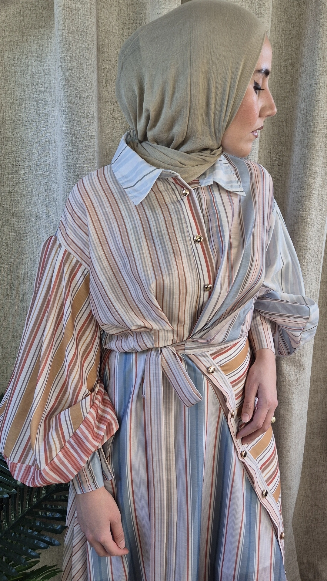 Deze jurk is een echte statement piece door de unieke mix van verticale en horizontale strepen in zachte aardetinten en blauw. De overhemdkraag en de knoopsluiting aan de voorkant geven de jurk een verzorgde uitstraling, terwijl de strikceintuur in de taille je figuur mooi accentueert.