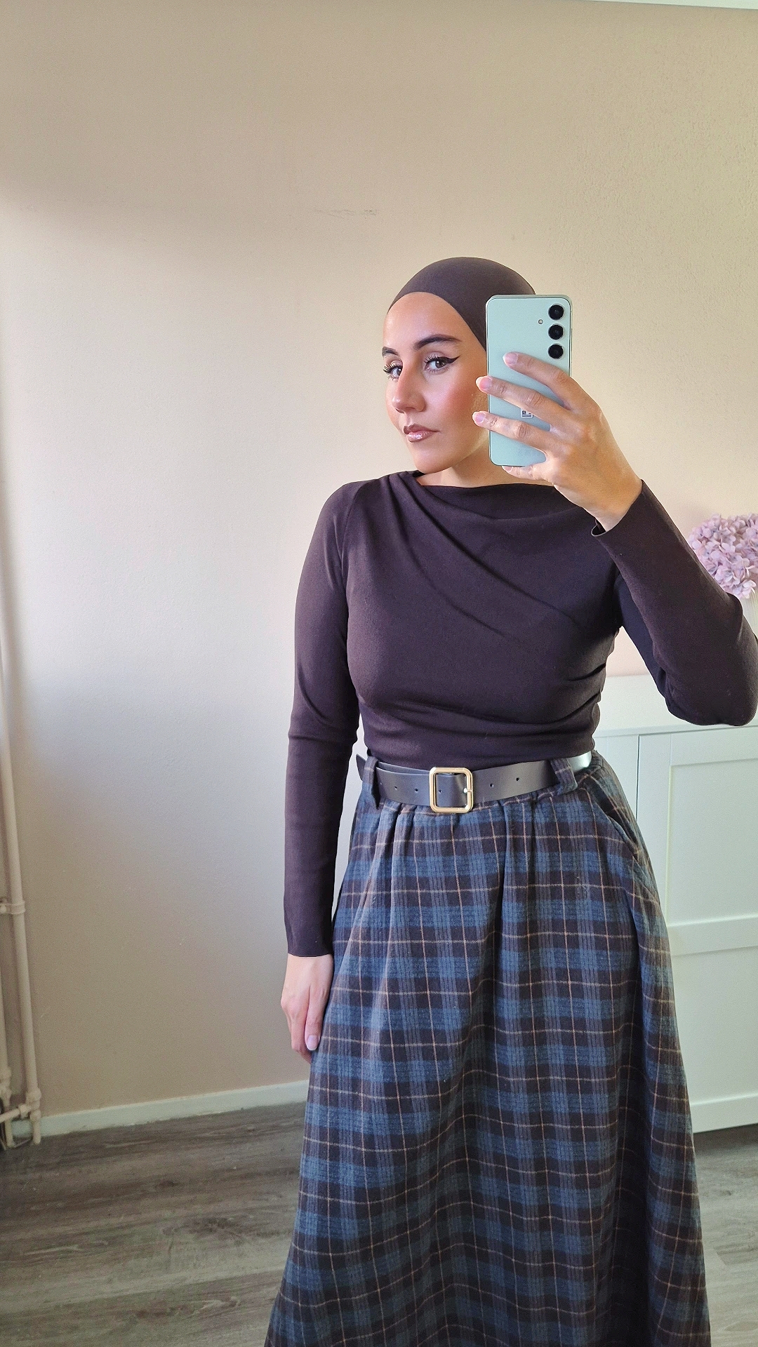 Deze elegante A-lijn rok is gemaakt van een zachte geruite stof die mooi valt. De comfortabele elastische tailleband sluit soepel aan zonder strak te zitten. Verder heeft de rok handige steekzakken en een chique brede riem die de taille prachtig accentueert. Perfect voor een modieuze en modest everyday look.