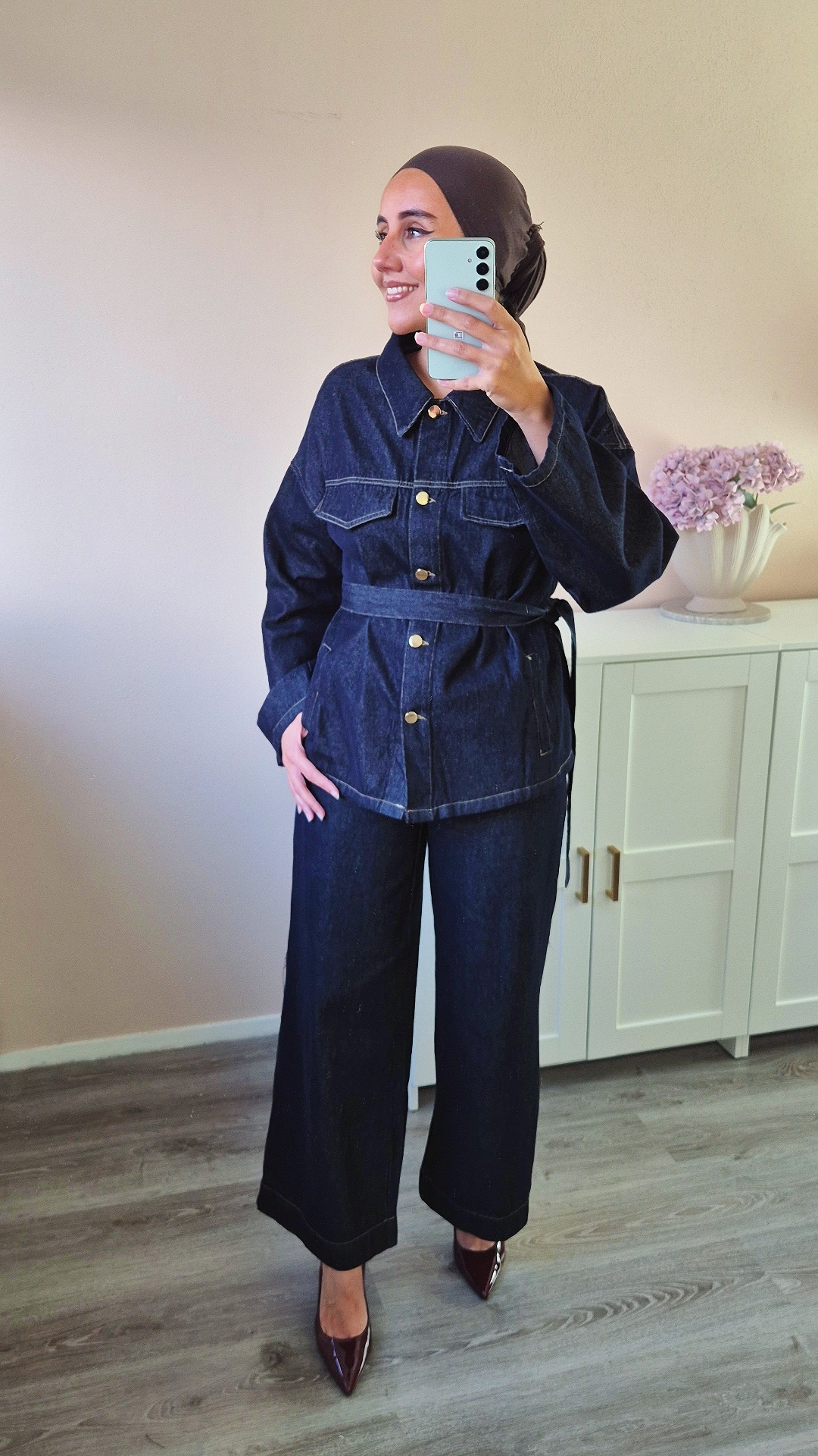 Upgrade je look met deze prachtige denim set. De blouse heeft een relaxte pasvorm, goudkleurige knopen en een ceintuur die je taille mooi accentueert. De wide leg jeans zorgen voor een modern, elegant silhouet en heeft een elastieke band aan de achterkant. Stoer, chic en perfect voor elke dag.